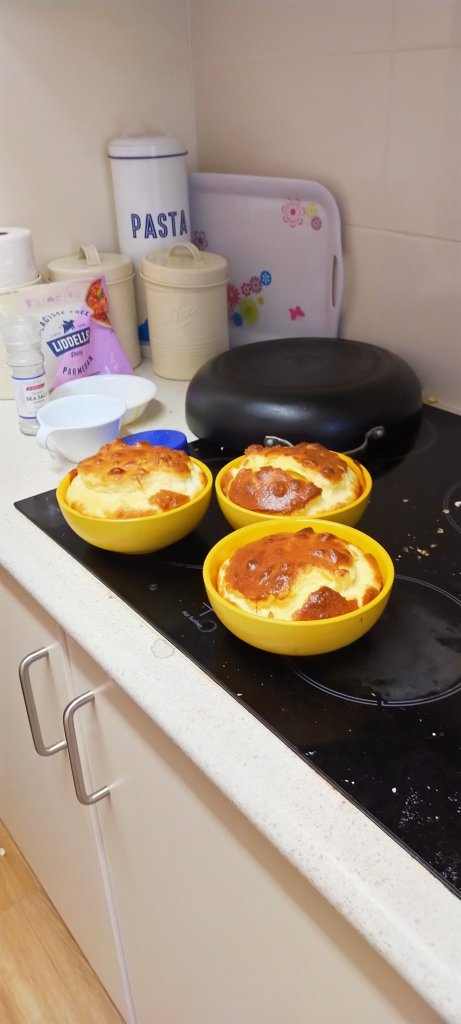 Dried grated bread crumbs sprinkled on to the sides and bottom of the ramekin (Aldi breakfast bowl in yellow) helped keep the shape but were not noticeable in the coked souffle. The secret to the pleasing risen shape is to run a clean finger around the top of the mix next to the bowl edge before putting in the oven.