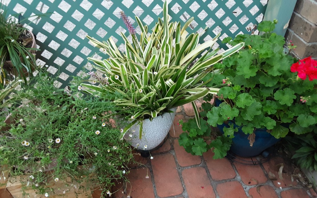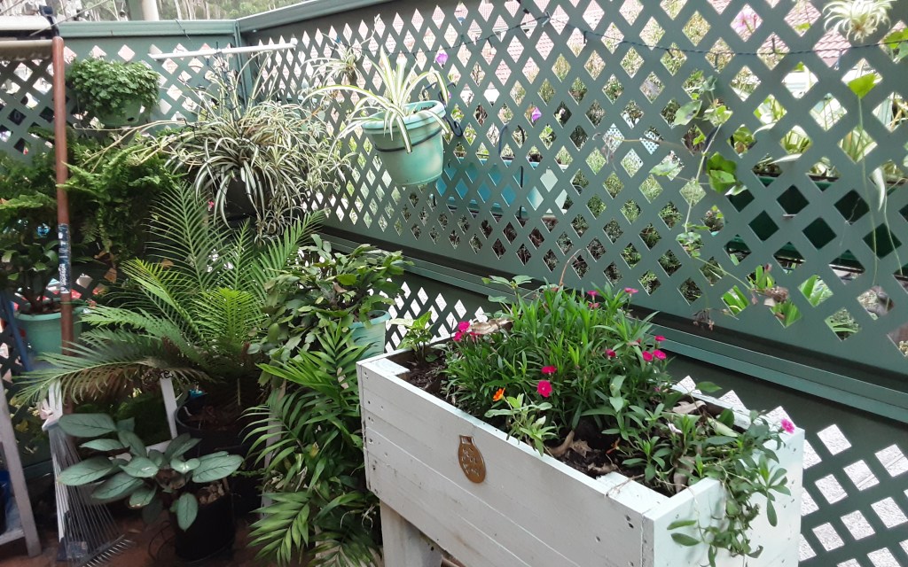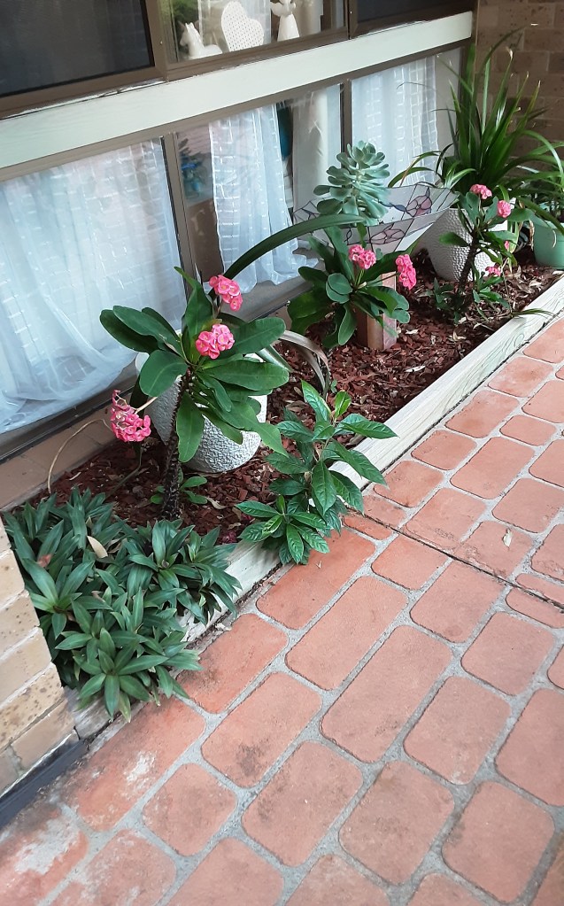 Welcome to Tory and anyone keen on gardening. I live in what we call a ground-floor unit in a retirement village on the East coast, 2 hours from Sydney. I have a covered patio next to a small coutyard, and nearly all the plants are in pots or planters.