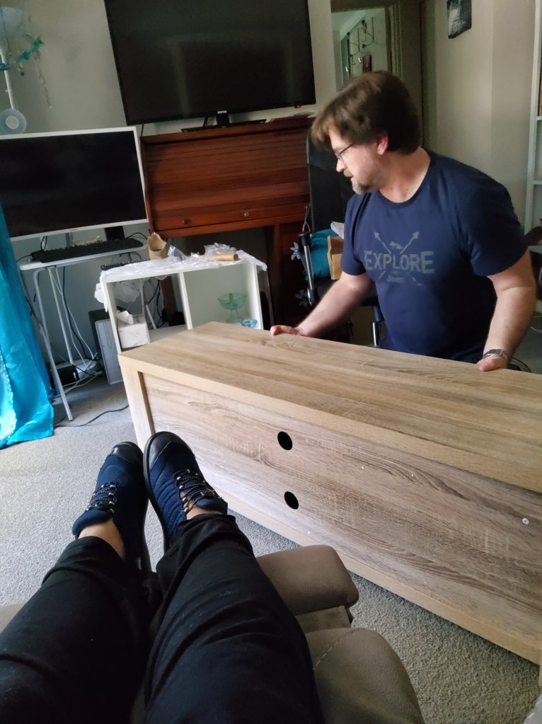 Sitting in my recliner watching my elder son assembling my latest flatpak purchase, calmly and without complaint. Methodical, turning a piece this way!, and that.